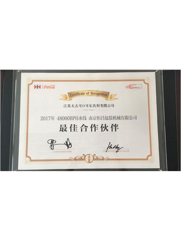 南京恒昌包裝作為后段整包商,在江蘇太古可口可樂(lè)48000bph水線項(xiàng)目中獲得“最佳合作伙伴”殊榮!